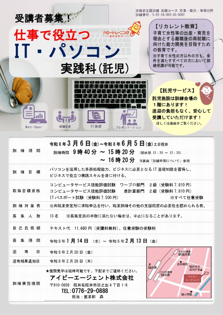 • 【訓練生募集中】仕事で役立つIT・パソコン実践科(託児)