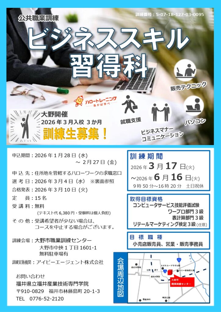 【訓練生募集中】ビジネススキル習得科(大野開催)
